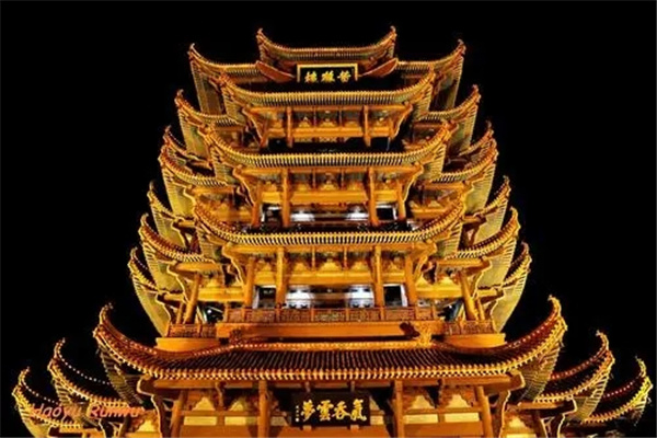 黃鶴樓內部雖然有鋼筋和混凝土,但是卻是仿木結構。黃鶴樓的高度約為50m左右,底層的寬度約達30m,而頂層較窄,其寬度保持在約為20m左右。整棟樓分為五層,樓頂極尖,并且在黃鶴樓的表面分布有金色的琉璃材質(zhì)的瓦片。